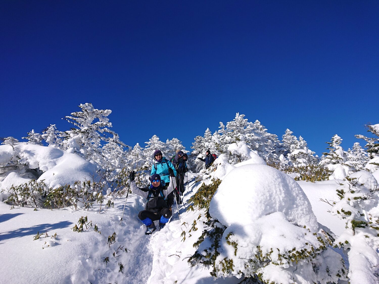 【山行日:2025/01/10~2025/01/13】朝6時ごろに登山口へ向けて4台の車で移動開始。いざ着いてみると駐車場が埋まっており、スペースが見つからない! 何とか奥へ進んだところに駐車場所を確保し、登山の準備を開始した。共同装備の分担を受け、すでにパンパンに膨らんでいたザックに無理矢理詰め込んで担ぐと、今までにない重量感! ついて行けるのか? 膨らんできた不安を押し殺し、7時前に歩き始めた。今日の泊地となる松峰小屋までは約980mの高低差、計画では6時間歩行の予定だ。天気は良く空は真っ青、途中の林道から中央アルプスの山並みが望まれ、疲れを癒してくれる。