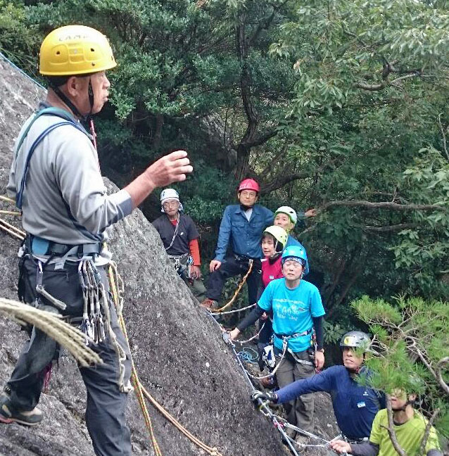幕岩教室は、鷹取山、モミソ懸垂岩、広沢寺、湯河原幕岩などの岩場で、トップロープのクライミングとビレイ(登攀者の確保)を学びます。また懸垂下降の訓練も行います。トップロープのクライミングを楽しめるようになることを目的としています。